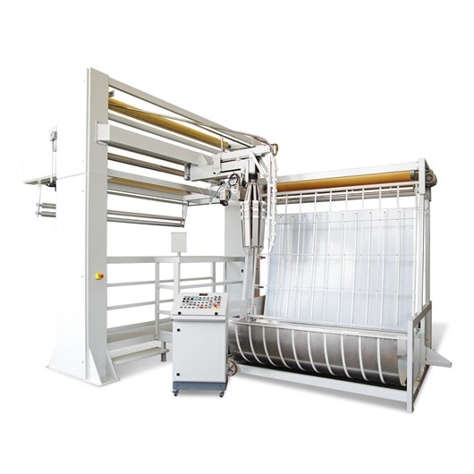 The machine is completed by some selvedge decurling systems such as variable-position spreading rollers and other systems specifically designed to ensure that the selvedge does not curl during winding.