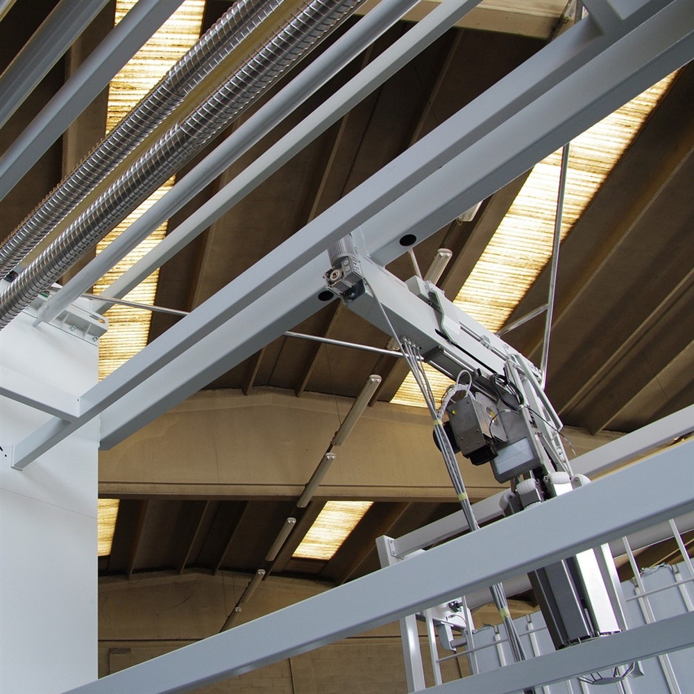 The core of the machine is the continuous cutting of tubular fabric, performed by a ΓΈ200 motorized blade complete with integrated blade sharpener. The cutting area consists of a "basket" into which the tubular fabric is insert, which rotates controlled by a manual or automatic handwheel, allowing the operator to always cut the fabric along the needle fall line.