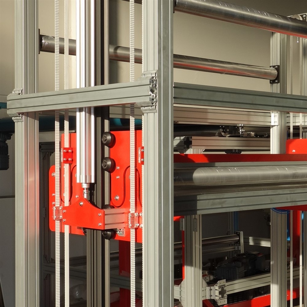 The next step in this line could be an accumulation system: the fabric passes through a pneumatically controlled, mobile roller accumulation system, which gives the fabric the desired tension and allows the exit area to never stop during the joining phase.
