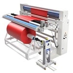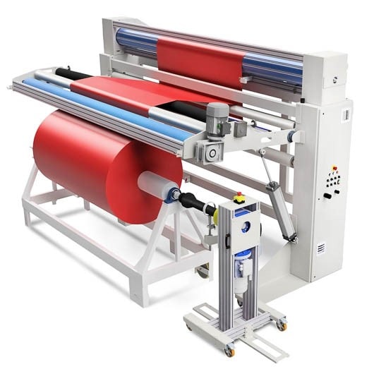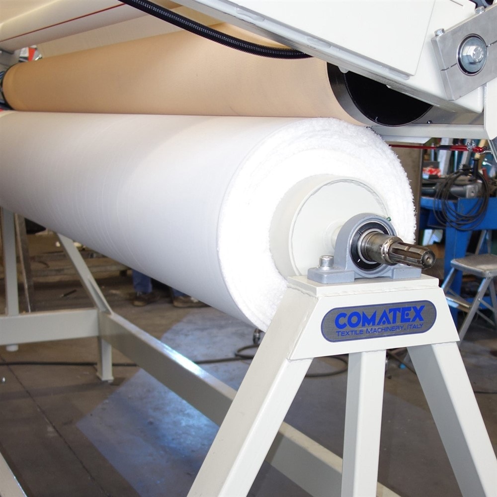 It consists of a tangential arm with a motorized drive roller, which rotates to set the big roll in motion. The pneumatically controlled tangential arm is the ideal system for stiff and poorly stretched fabrics.