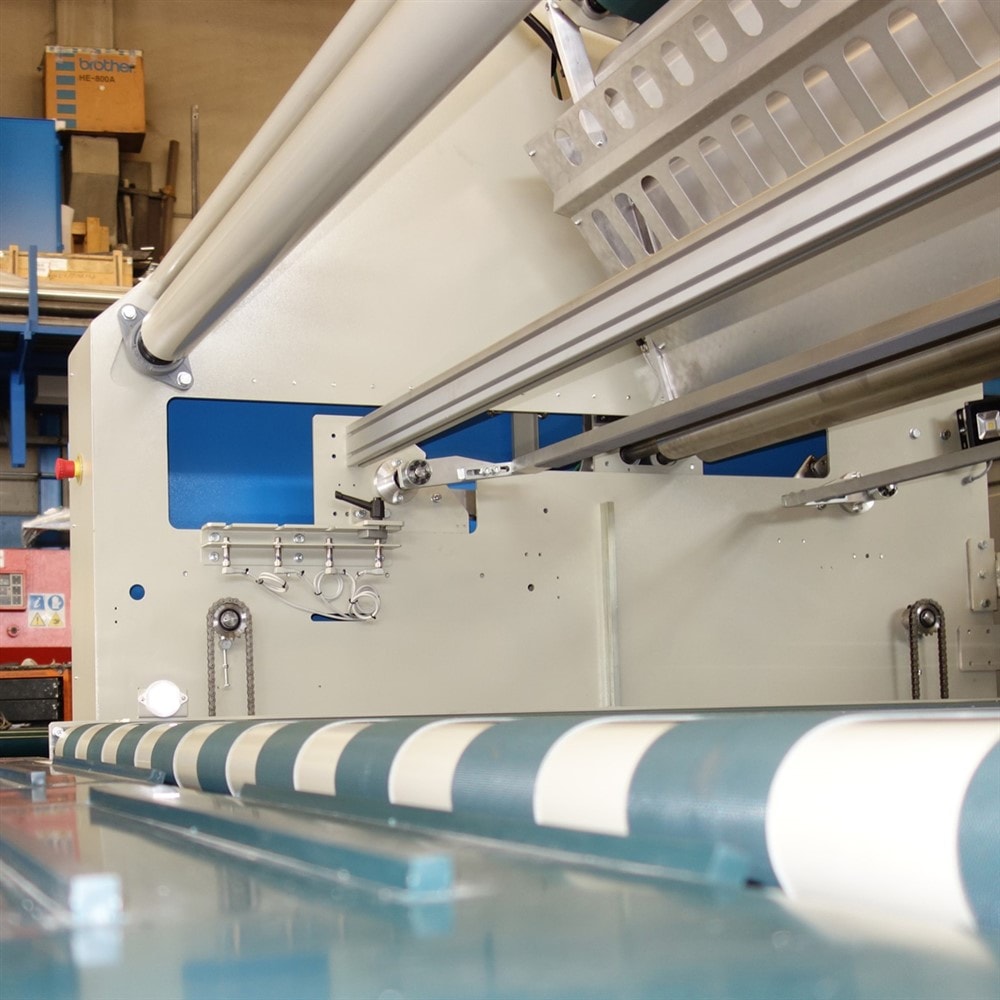Once the height of the pack, set by the operator, or the desired length has been reached, the machine automatically cuts the fabric just before the plaiting rollers.
