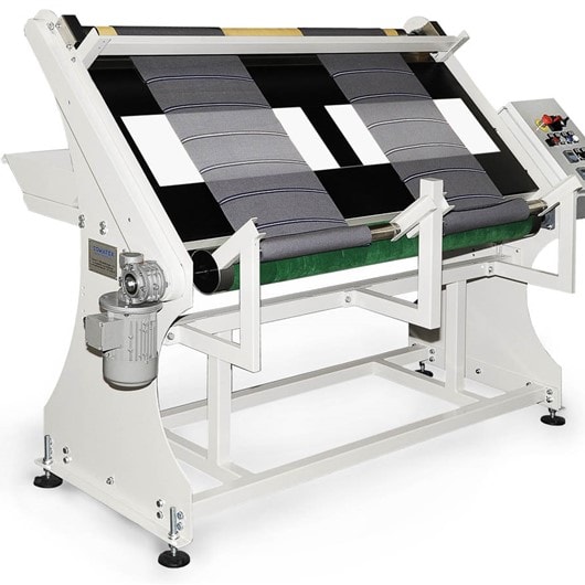 Unwinding is performed by a drive roller that picks up the collars from a box that can hold rolls or plaited fabrics. From the drive roller, the collars descend onto an inspection table, typically consisting of a lighted table surrounded by black areas ideal for contrast.
