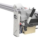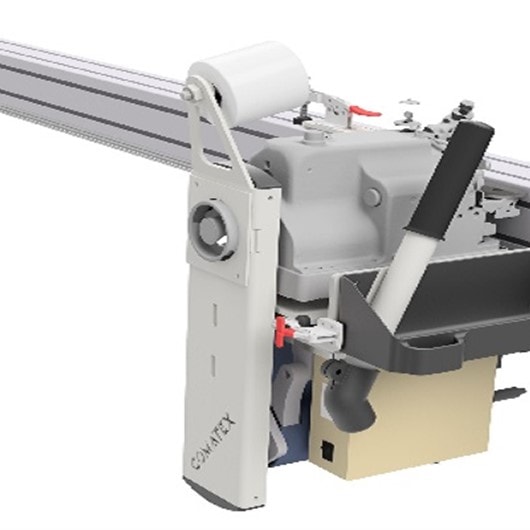 Binario di cucitura automatico, permette di unire i rotoli di tessuto in automatico con un perfetto allineamento dei bordi e del parallelismo dei tessuti migliorandone il controllo della tensione.