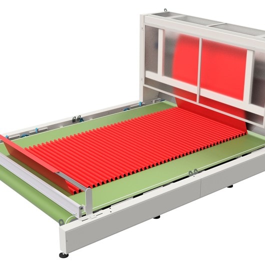 At the end of the belt, a sensor controls the unloading area, so that the fabric is always picked up in the correct position and no additional tensions are created.