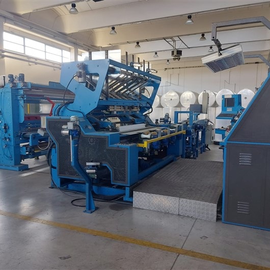 SIDE ARMS for housing the cardboard tube allow the product to be wound in contact with the cylinder. The roll is unloaded onto a conveyor belt and the cardboard tube is loaded in the intermediate position.
