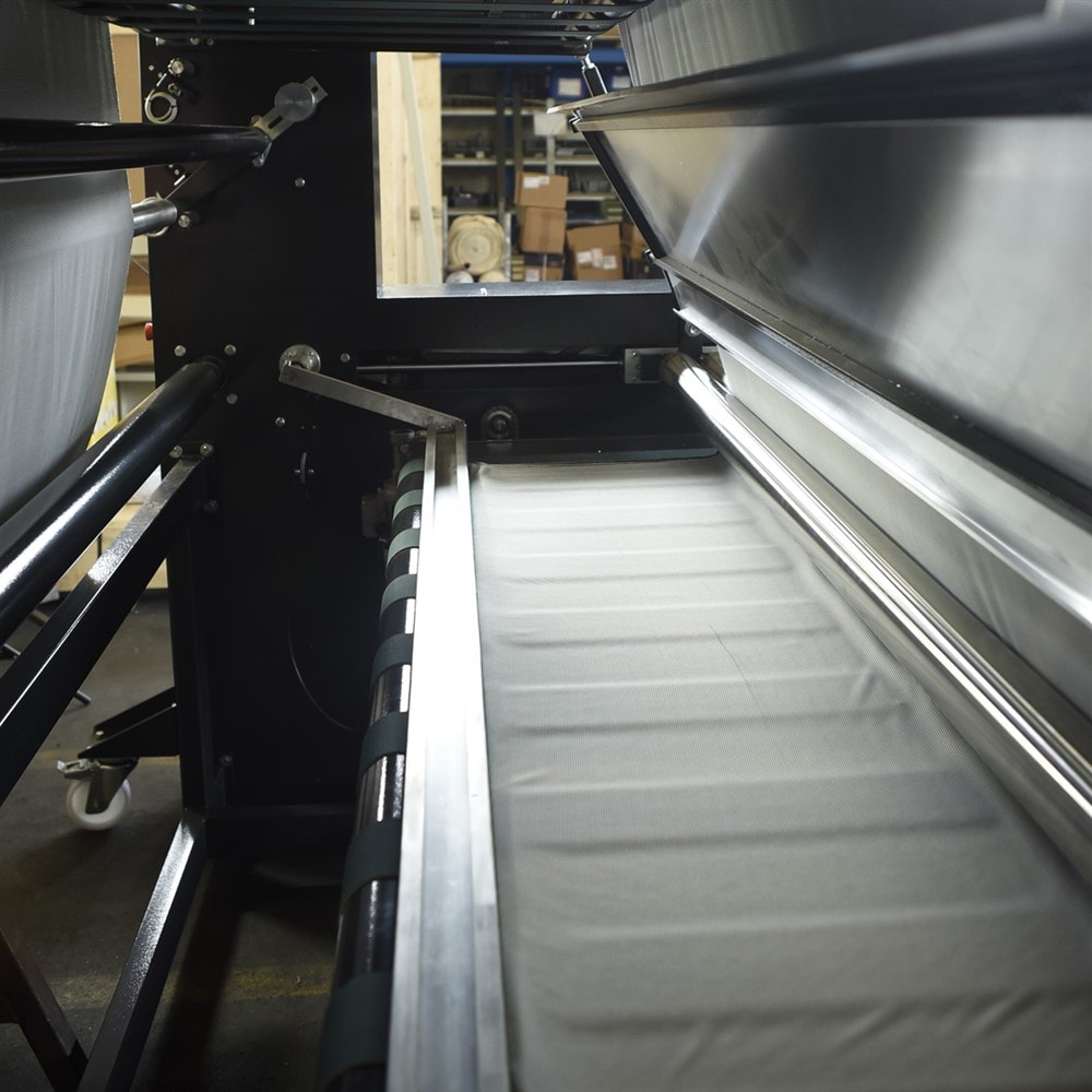 Una volta raggiunta l’altezza del pacco, prefissata dall’operatore, o la metratura desiderata, la macchina taglia in automatico il tessuto appena prima dei rulli di faldata.