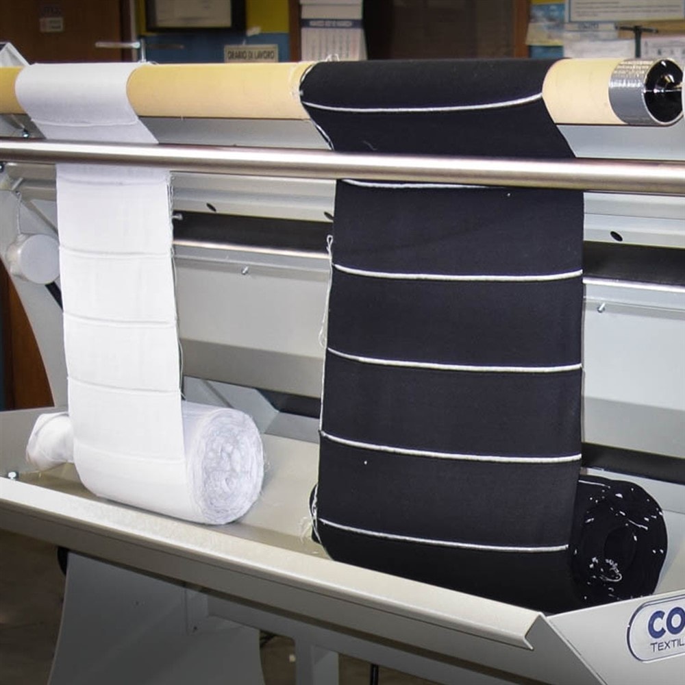 L’avvolgimento avviene su due assi distinti, senza cartone, che per gravità rimangono in appoggio al rullo di avvolgimento e creano i nuovi rotoli di tessuto.
